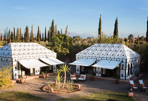 This spacious King-size room brings a touch of oriental charm with soft greens, creams, and beautiful local artwork. It features an ensuite tadelakt bath/shower room and is located in our traditional riad courtyard. With a private terrace overlooking the lush gardens on one side and the riad and Colonial Room on the other, it’s a peaceful and charming spot to relax. Situated close to the Mehdi and Assia Glamping Suites.